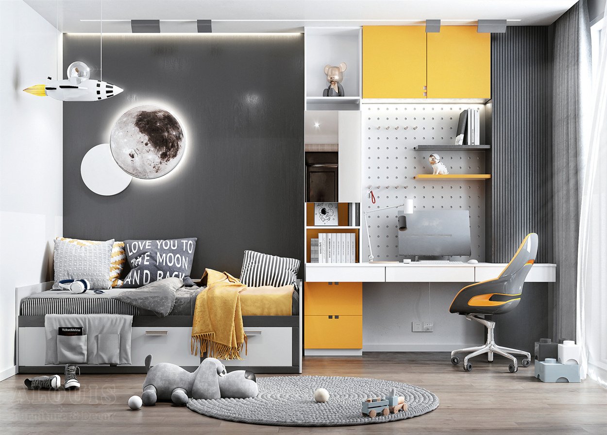Dưới đây là các mẫu thiết kế nội thất phòng ngủ cho bé trai mà bạn có thể lựa chọn để thi công nội thất phòng ngủ cho con trai của mình: