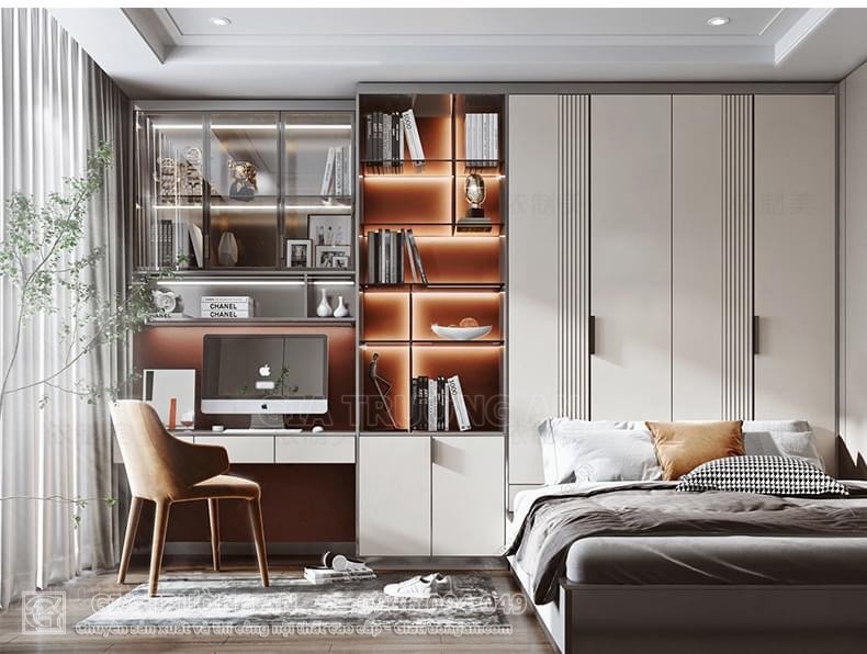 Trong thời đại công nghệ phát triển, làm việc tại nhà trở thành một xu hướng phổ biến. Vì vậy, thiết kế nội thất phòng ngủ phải thay đổi để phù hợp với nhu cầu của những người làm việc tại nhà. Một trong những yếu tố quan trọng trong thiết kế phòng ngủ là bàn làm việc và kệ sách kế bên đầu giường.